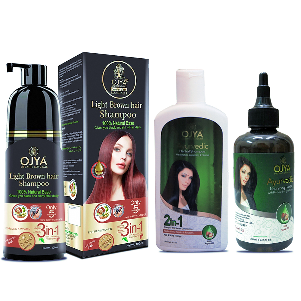 LIGHT BROWN COLUR SHAMPOO 400 ML ( 70 % TO 100% GREY HAIRS CUSTOMER CAN USE ) ALONG WITH POST SHAMPOO 200 ML AND HAIR OIL 200 ML