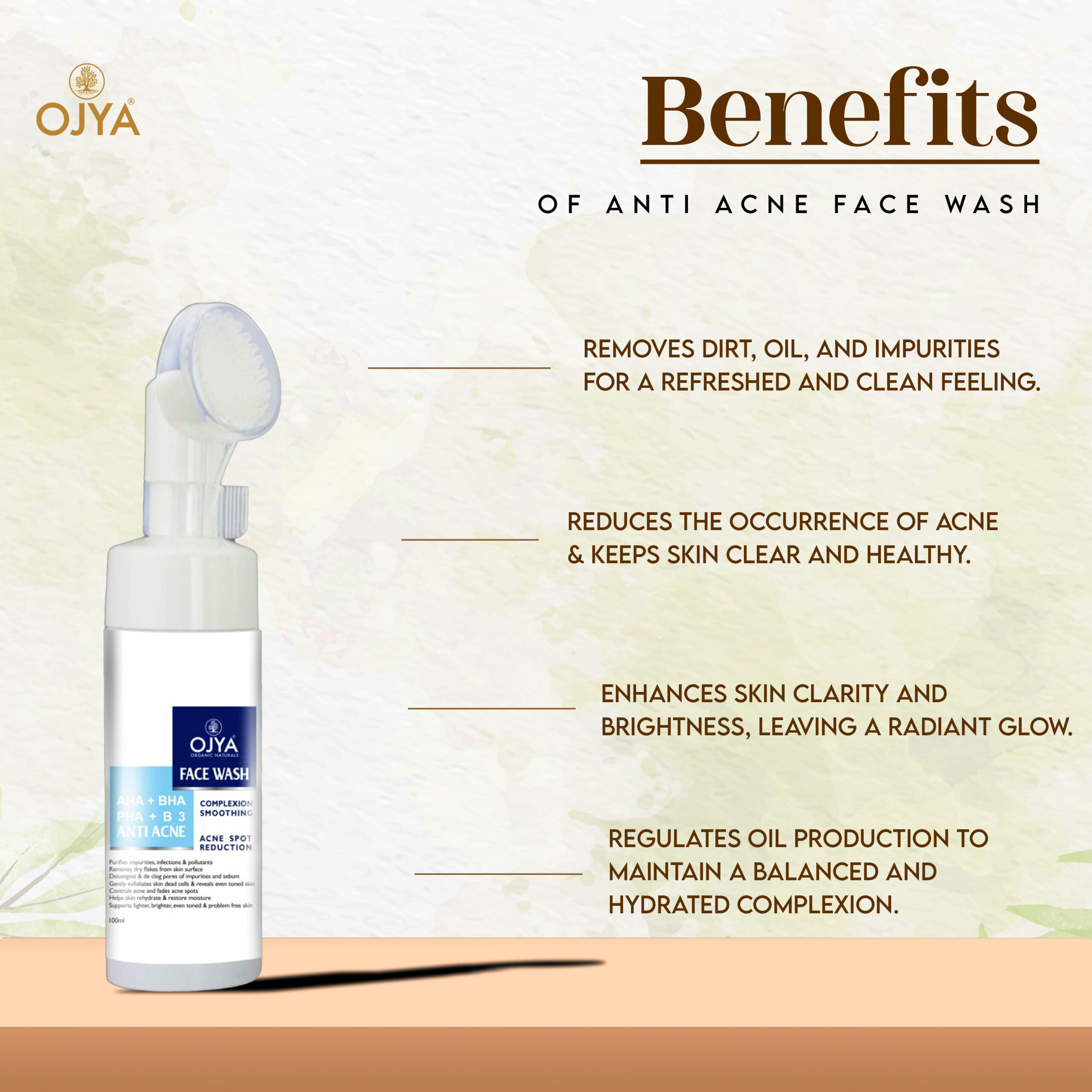 OJYA AHA + BHA + PHA + B3 is an oil-free – soap-free foaming face wash that deep cleans, detoxifies and exfoliates skin to resurface a soft, smooth, even toned & problem-free glowing complexion. AHA, BHA & PHA work in synergy with Vitamin B3 to promote a clear and perfected complexion that is very less prone to skin breakouts.