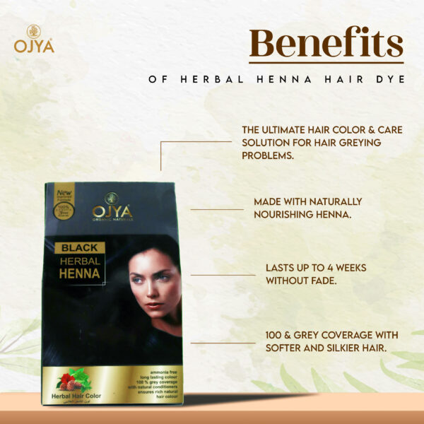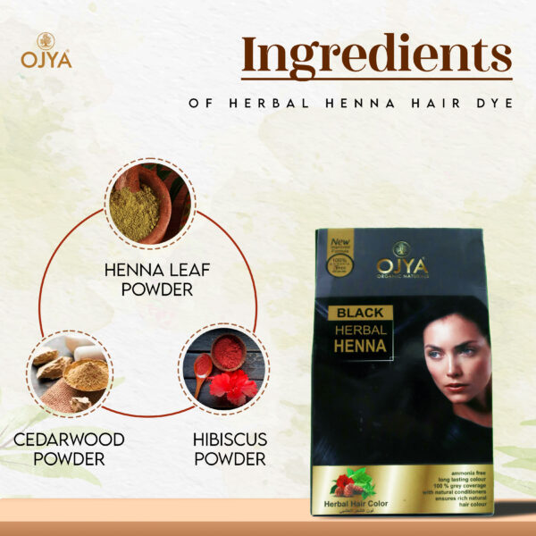 Ojya Premium Herbal Henna is the ultimate hair color and care solution for hair greying problems. Made with naturally nourishing and conditioning Henna, Hibiscus & Cedarwood, this no ammonia formula offers long-lasting color and 100 & grey coverage with softer and silkier hair. This safe hair color ensures rich natural vibrant color that lasts up to 4 weeks without fade.