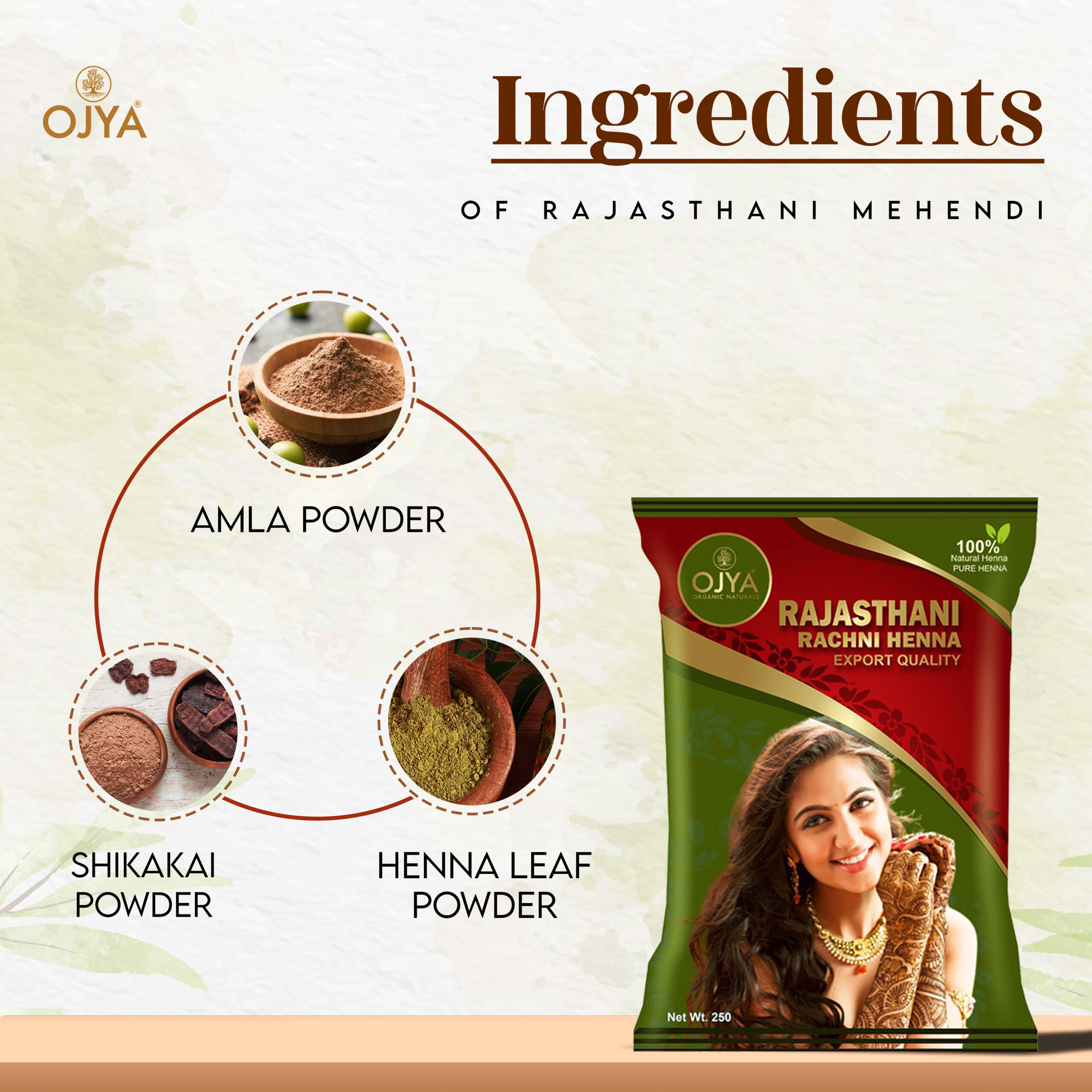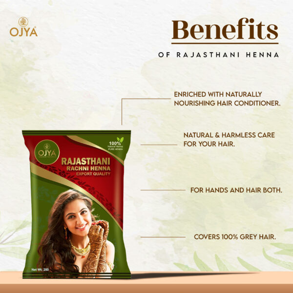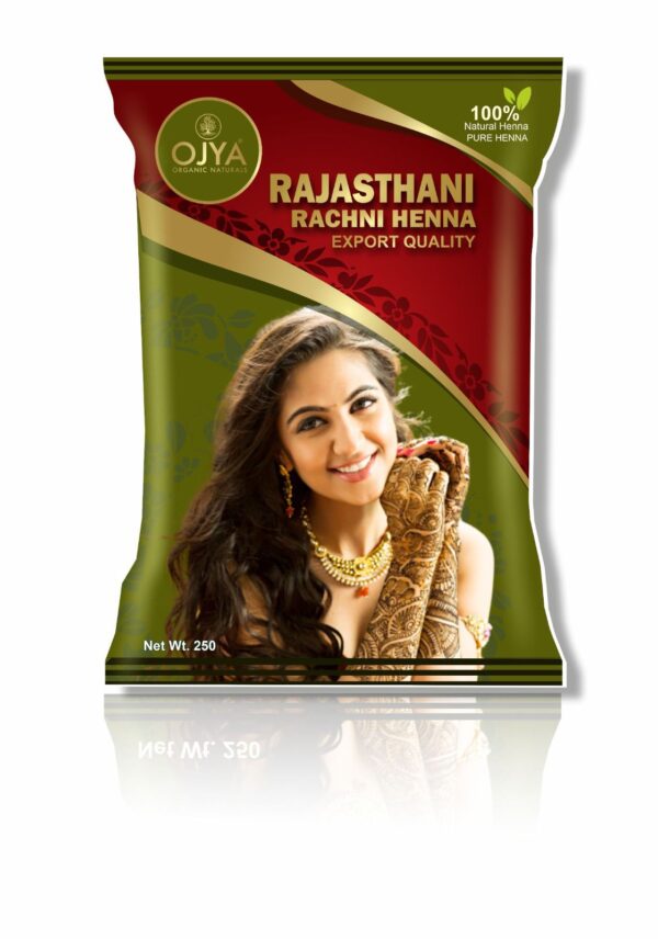 Made with 100 % purely natural and ultra-fine Rajasthani Rachni Henna, OJYA PURE HENNA is free from all dyes and chemicals and imparts long-lasting vibrant dark shades of henna on hands and body.
