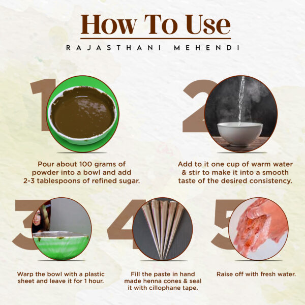 HOW TO MAKE A HENNA PASTE: Pour about 100 grams of OJYA Pure Henna Powder into a bowl and add to it 2-3 tablespoons of refined sugar. Add to it one cup of warm water and stir to make it into a smooth paste of the desired consistency. Wrap the bowl with a plastic sheet and leave it aside at least for one hour. Fill the paste in hand-made henna cones and seal it with cellophane tape.